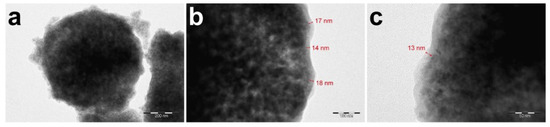 According to the scheme described above, mineral magnetic calcium carbonate particles coated with bovine serum albumin and tannin acid shells were obtained. The TEM images reveal a clear contrast between the mineral CaCO3/Fe3O4 core and organic protein-tannin shell of the carriers. Moreover, the inhomogeneous nature of the mineral core can also be recognized due to various interaction of the electron beam with Ca and Fe atoms. The low-magnification image (Figure 2a) additionally shows some presence of the free organic phase that may be formed as a result of the partial desorption of Fe3O4 nanoparticles during the deposition of protein-tannin layers and further adsorption of BSA and TA on these particles. The high-magnification images show an apparent border between the mineral core and protein-tannin shell that allows for estimating the shell thickness. According to this preliminary estimation, the thickness of the protein-tannin shell varies from 13 to 18 nm that can be attributed to the globular nature of protein layers (Figure 2b,c).