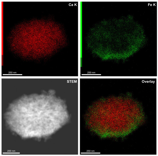 The elemental mapping of a CaCO3/MNP3/(BSA-Cy7/TA)2 carrier demonstrating the calcium and iron distribution in the mineral core.
