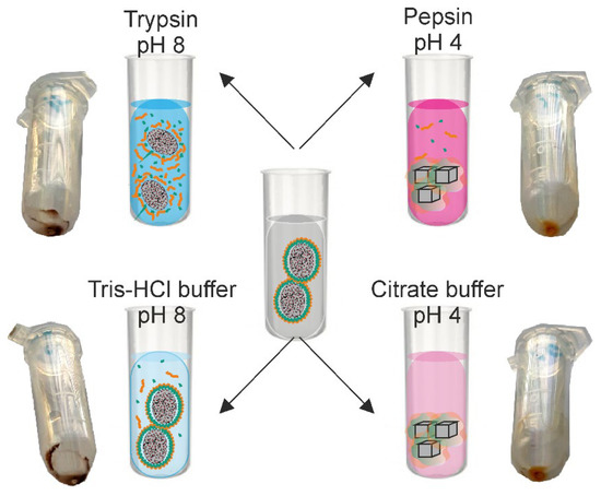 Proteolytic hydrolases (trypsin and pepsin) have been widely used as model enzymes for the study of enzyme-induced degradation of protein-containing complexes, [17], as demonstrated by the degradation of the layer-by-layer assembled bovine serum albumin (BSA)-polyphenol microcapsules by trypsin, chymotrypsin [16,18], simulated gastric fluid (SGF), and simulated intestinal fluid (SIF) [18]. It was shown that these microcapsules were stable in the presence of gastric pepsin in the SGF, whereas they deteriorated rapidly in the presence of trypsin in the SIF [18]. The degradation of pea protein and tannic acid (TA) complexes was studied in the simulated gastro-intestinal model [19]. The digestion of complexes based on sorghum TA and wheat proteins was studied in the presence of the α-amylase and amyloglucosidase [20].