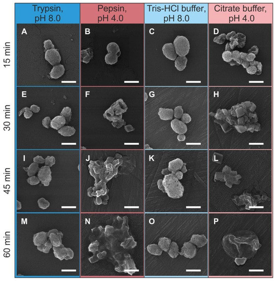 SEM-images of CaCO3/MNP3/(BSA-Cy7/TA)2 structures after incubation in solution of trypsin (1 mg/mL) in 50 mM Tris-HCl buffer (pH 8.0) (A,E,I,M), pepsin (1 mg/mL) in 50 mM citrate buffer (pH 4.0) (B,F,J,N), and in pure buffer solutions: 50 mM Tris-HCl buffer (pH 8.0) (C,G,K,O) and 50 mM citrate buffer (pH 4.0) (D,H,L,P). The scale bar corresponds to 1 μm.