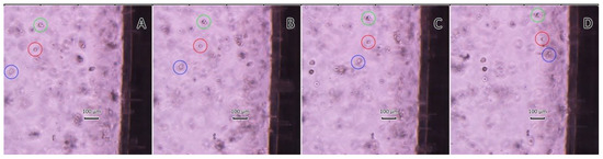 Snapshots from the video at different time intervals (A–D), which show the movement of the 4T1 breast cancer cell with CaCO3/MNP3/(BSA-Cy7/TA)2 carriers (for example, cells are highlighted in green, red, blue circles) in the field of action of the permanent magnet (the magnet is located on the right).