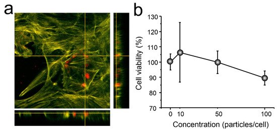 (a) CLSM orthogonal projection of carriers inside 4T1 cells after 24 h joint incubation (Red is fluorescence due TRITC in particles); (b) cytotoxicity (WST-1) of carriers for 4T1 cells after 24 h join incubation.