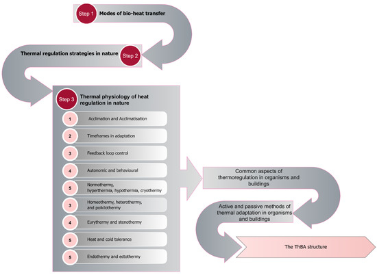 The analogy between active and passive thermal adaptation strategies in organisms and buildings informed the primary structure of the ThBA, which had three parts. Two were related to passive and active strategies for animals and one for strategies used by plants. The latter had only one part since the main principles relating to active and passive strategies as provided by IUPS did not match properly with the thermoregulatory mechanisms used by plants.
