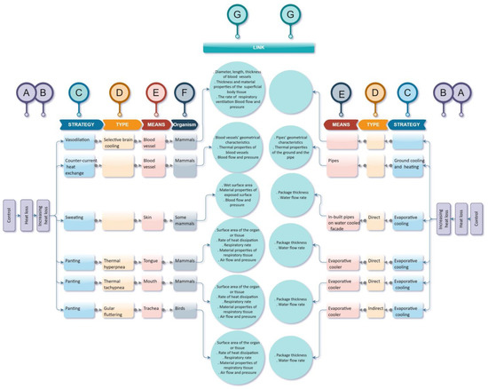 The links created in the ThBA can be used for translating the thermoregulatory principles in sweating and panting to parallels with the function of evaporative coolers. The ThBA thus lists the key parameters which are necessary for transferring mechanisms from biology to architecture, which then need to be explored by the building designer. For example, in thermal tachypnea the respiratory parameters, air sac properties and cooling efficiency of panting in birds affect their panting mechanism [43]. The designer similarly needs to consider the size and properties of a system of evaporative cooling so that it is suitable for the building. Obviously, the links between evaporative cooling in organisms and buildings are well known, but the hope was that the structure of the ThBA would lead to new opportunities for applying thermoregulatory systems found in organism to buildings. A full description of the creation of the final version of the ThBA and its testing can be found elsewhere [8].