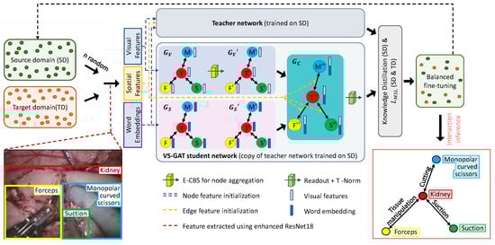 To perform surgical scene understanding, we employed a graph network inspired from VS-GAT [] that uses ResNet18 [] as the FEN. Firstly, the performance of the graph network in interaction detection was enhanced using E-CBS and T-Norm. Secondly, to achieve incremental DG in surgical scene understanding, a two-tier approach was adopted: (a) As the graph network relies heavily on its embedded features, the FEN was extended to the target domain using IL [] to cater to the domain shifts and the novel instruments. (b) Motivated by the IL technique [], we then adopted the teacher–student training regime from knowledge distillation to extend the graph network to a new domain dataset without sacrificing much of its performance on the old dataset. The graph network was first trained on the source domain. Considering this trained model as a teacher network, a copy (student network) was then generalized to the target domain.
