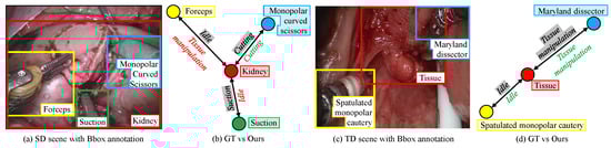Surgical scene understanding paves the way for embedding situational awareness into robotic systems assisting surgeons in minimally invasive surgery. The current systems’ inability to understand the surgical scene renders it difficult to address the key limitations of minimally invasive surgery—lack of haptic sense, situation responsiveness, and lack of a standard surgeon evaluation matrix [,,,,]. When given the ability to mimic human scene understanding, such as instrument–tissue interaction detection, the system could trigger haptic feedback based on tissue-instrument interaction, serve as a second pair of eyes monitoring the surgery, evaluate the surgeon’s performance, and generate surgery reports. In recent times, many deep learning models that fundamentally perform scene understanding have been introduced for surgical workflow detection [], surgical phase detection [] and surgical skill evaluation [,]. As the instrument–tissue interaction model is aimed at capturing key interactions happening in surgery, the detected sequence of key interactions could potentially improve the surgical workflow recognition and surgical skill evaluation tasks. By detecting key interactions, it can also be potentially integrated with teaching by demonstration modules, to teach and evaluate surgical residents. While instrument–tissue interaction detection models have the potential to significantly improve such downstream tasks, realizing a interaction detection model is challenging. With the number of instruments and interactions constantly changing during a surgery, every scene (frame) may have different numbers of inputs and outputs (different numbers of instruments and interactions), and thereby each scene poses a unique Euclidean space problem. Furthermore, each interaction between the tissue and an instrument in a scene could depend on various local and non-local factors: (a) tissue features, (b) primary instrument features, (c) secondary instrument features (when the secondary instrument is used to manipulate the primary instrument), (d) instrument positions, and (e) overall surgical scene features. These factors present the instrument–tissue interaction detection task as a non-Euclidean space problem, making it challenging to solve it using traditional convolutional neural networks []. While these limitations have been addressed by employing graph networks [], the task gets further complicated when the model needs to be extended to new surgical domains. Firstly, the domain shifts (the changes in instruments and tissue features) in new surgical scenes raise concerns over any model’s performance. Secondly, the inclusion of novel instruments and tissues in the new surgical domain warrants the model being retrained on both the old and new datasets.