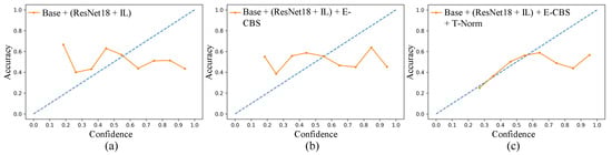 Reliability diagram: (a) Base + (ResNet18 [] + IL []), (b) Base + (ResNet18 [] + IL []) + E-CBS and (c) Base + (ResNet18 [] + IL []) + E-CBS + T-Norm.