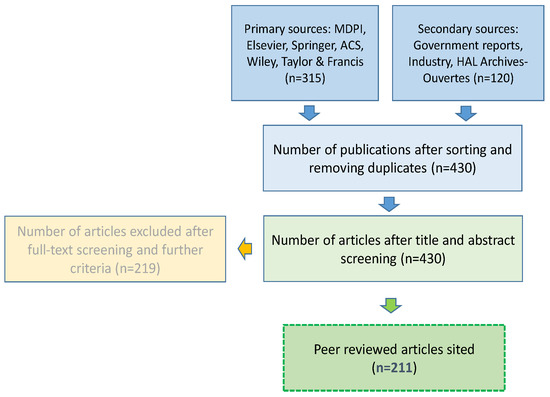 A rigorous review framework was adopted in the preparation of this review paper. The review process was aligned with the PRISMA guidelines for systematic reviews and meta-analyses (see Figure 2). The majority of data were sourced from published articles. More specifically, the peer-reviewed data were sourced from the following primary databases: MDPI, Elsevier, Springer, Wiley, and Taylor and Francis. Secondary sources were also taken into account, such as government reports published by the USDA and European Commission and industry stakeholders, including Boston Dynamics, Arugga AI, and Bird Gard Australia. The literature focuses on recent developments in biomimetics research and potential applications in agriculture. The articles were selected using keywords such as bio-inspired, biomimetics, biomimicry, agriculture, smart agriculture, solar panels, tropism, soft robotics, swarm robotic structures, and materials. The research was mainly focused on English-published papers to avoid translation delays. The publication period was between 2005 and 2022. The search window was justified considering it was necessary to understand how biomimicry has evolved over the years and how it can be applied in agriculture. The inclusion and exclusion criteria were characterized by a title and abstract screening followed by a full-text screening process, which focused on the relevance of the subject. Part of the grey literature was excluded because it did not satisfy the inclusion criteria.