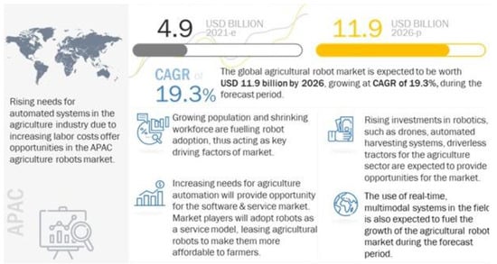The term “swarm robotics” refers to a combination of different micro-robotic systems, simple and homogeneous or heterogeneous agents, coordinated in a decentralized and distributed manner [105]. The development of swarm robot bees is a case in point [105,106,107]. Swarm robotics is unique because they lack a centralized control and act according to simple and local behavior, and this behavior is capable of solving complex tasks. The fundamental characteristics of swarm robotics include autonomy and the ability to cooperate to solve different tasks. The autonomy of robotic systems is important because it predicts the commercial application of swarm robotics. Recent industry data estimated that the cumulative annual growth rate would be about 9.9% and market capitalization would exceed $81 billion [108]. The projections made by Bluewave Consulting [108] were in line with other market reports, which forecasted a CAGR of 19%. However, the market value in the latter case was estimated at $11 billion [109]. The current state of the swarm robotics global market is illustrated in Figure 5. According to Figure 5, market growth was reinforced by investments in robotic systems, the consumer adoption of real-time multimodal systems, and agricultural automation.