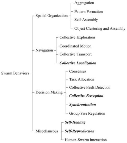 The link between different swarm behaviors, application and adoption, and environment [116].