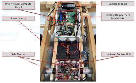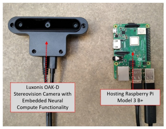 Beyond the bio-inspired bird management systems, various farm activities can provide the basis for experimentation with biomimetic systems in agriculture, such as human- and path-following robotic mules or shepherd robots [145,146,147,148,149]. These systems may include monocular, stereo, or thermal vision combined with various assistive components, such as voice recognizers or neural network operation accelerators. Figure 8 shows details of the core engine of the robot presented in [145], where the machine vision process on a raspberry pi unit is assisted by an Intel® Neural Compute Stick 2 accelerator chip, while details of the electromechanical actuators and controllers are also depicted. Figure 9 shows a Luxonis OAK-D stereovision camera that incorporates the same chip with the Intel® Neural Compute Stick 2 for faster processing, thus leaving enough processing power on the hosting raspberry unit available for serving complementary tasks.