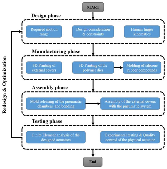 Figure 1 illustrates the flowchart of the actuator’s production. More specifically, the actuator was designed to imitate the motion of the human finger with an enhanced angular range from −180° to 180°, taking into account the respective design considerations and constraints. An external modular cover was also designed in order to enhance the actuator’s structural integrity and multi-functionality. Then, the designed components were manufactured by employing additively manufactured dies for the molding of the pneumatic system and the selective laser sintering (SLS) AM technique for the external covers. The assembly process was performed with the assistance of Kevlar fiber reinforcement to improve the actuator’s durability. It is worth mentioning that the functionality, strength, and motion study of the designs were evaluated through finite element analyses (FEA), and the final physical actuators were tested via quality, endurance, and mechanical tests. Finally, potential applications of the developed soft actuator were examined and analyzed.