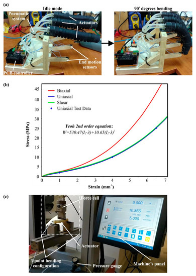 In the last decade, robotic systems and automation have undergone rapid development and implementation in various applications due to the increased need for automation arising from the fourth industrial revolution [1,2]. Thus, there is a demand to improve the existing robotic platforms and discover novel methods to produce and employ innovative robotic tools, such as grippers, novel mechanisms, etc., that will assist in agile production. The majority of robotic systems are fabricated with rigid materials, in order to handle increased mechanical loads, perform high precision motion and operate under demanding industrial environments [3]. However, due to safety reasons, the operation of these systems is limited in applications which require safe human–robot interaction. Hence, soft robotic systems draw increased interest for applications with real human–robot collaboration and robotic manipulations in tasks that involve fragile or sensitive objects, such as fruit grasping, etc. [4], which demand delicate handling.