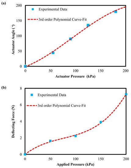 After the quality control process and the determination of the best method for the actuator reinforcement, the next step of the study was to perform a series of experiments and measurements in order to evaluate the actuator’s performance and gather the necessary data for the calibration of the FE model. First, the bending angle was connected with the applied pressure, utilizing a protractor and a pressure gauge. The actuator’s bending angle is defined by the angle of the arc that is formed between the first (idle position—0° degrees) and the final position of the actuator’s tip. It is worth mentioning that the measurements were verified by exploiting the measurements of the one-axis flex sensor. Figure 7a depicts the measurements for an angular range from 0° to 180°, coupled with the graphical relation between the applied pressure and the bending angle. For variations in the low air pressure region (<100 kPa), the changes in the bending angle are small with an almost linear relationship; as the actuator moves into higher bending angles, it requires higher changes in pressure resulting in a flattening of the curve. Thus, a third order polynomial equation is required in order to accurately capture the relationship between the applied pressure and the bending angle, which is presented in Equation (2). It is worth noting that Φ is the actuator’s bending angle, pin is the applied air pressure, and polynomial coefficients were calculated by curve-fitting the curve on the experimental data. The next measurement was focused on the calculation of the deflecting force produced by the actuator during its operation (Figure 7b). According to the acquired data, for low applied pressures below the 50 kPa, the relationship between the produced force and the applied pressure was close to linear. For moderate applied pressures between 50 kPa and 100 kPa, the slope of the curve was severely reduced. However, after 100 kPa applied pressure, the produced force increases at an exponential rate. Hence, a high applied pressure range (>100 kPa) was required in order to achieve sufficient deflecting forces. After multiple repetitions of the experiments, the maximum deflecting force, that secured the actuator’s structural integrity, was measured at 7.298 N. Furthermore, a numeral third order polynomial function was built, exploiting the acquired data via the curve-fitting process (Equation (3)), where Fd is the deflecting force and pin is the applied pressure.
