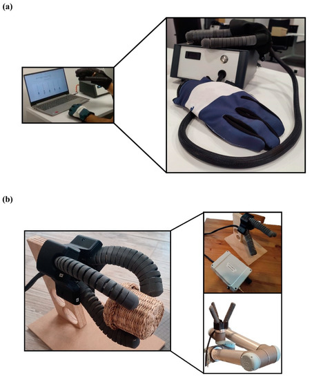 In the current study, a soft actuator was developed and produced with multiple functionality purposes. In detail, in the context of this research, the developed soft actuator was combined with others and tested in two different realistic-use cases. It is worth mentioning that the external 3D printed covers were altered in terms of material and geometry for each case depending on the requirements and constraints of the application. The first case was to assemble five actuators on a glove to constitute a human hand exoskeleton, according to guidelines in the literature [39,40]. Thus, each actuator was bonded to the external side of each finger of the glove, as it is presented in Figure 9a. These hand exoskeletons could be utilized by patients with mobility difficulties and neurological disorders. In this case, the exoskeleton has two applications; the first is for rehabilitation purposes in order to restore the functionality of the damaged limb, or for patients that have completely lost the functionality of their finger. For this application, the external covers were made of rigid polymer (PA12) and the angular range was selected from 0° to 180°, without enabling the extension motion for negative degrees.