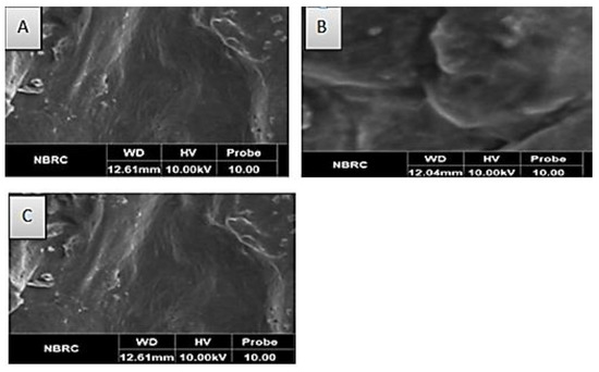 The SEM fingerprint for each of the encapsulated probiotics with L. plantarum is shown in Figure 1A–C. As shown in Figure 1A–C, pores were observed in all types of encapsulated cells. Additionally, all pores were not homogenous. The presence of a dark surface was also observed in the beads. The presence of the probiotics in coated materials showed that the used wall materials are important in augmenting the viability and stability of probiotics under hostile conditions.