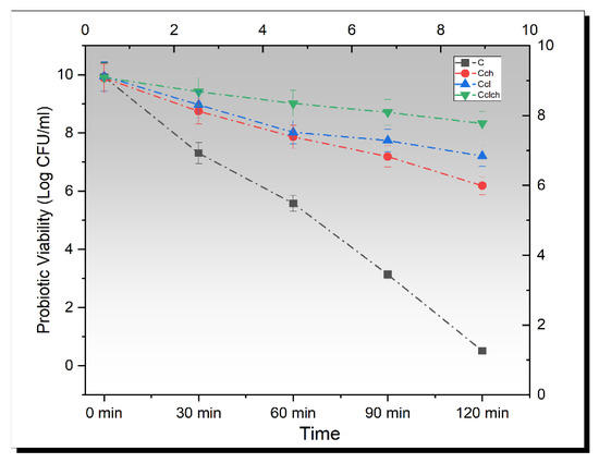 Viability of un-encapsulated and encapsulated (cellulose, chitosan, and cellulose–chitosan hybrid cells) probiotic microgels under simulated gastric fluid conditions during storage intervals (0, 30, 60, 90, and 120 min) compared with control. Each line represents mean value for viability of treatments. C (un-encapsulated probiotics), Cch (L. plantarum encapsulated with chitosan), Ccl (L. plantarum encapsulated with cellulose), and Cch-cl (L. plantarum encapsulated with chitosan and cellulose hybrid cells).