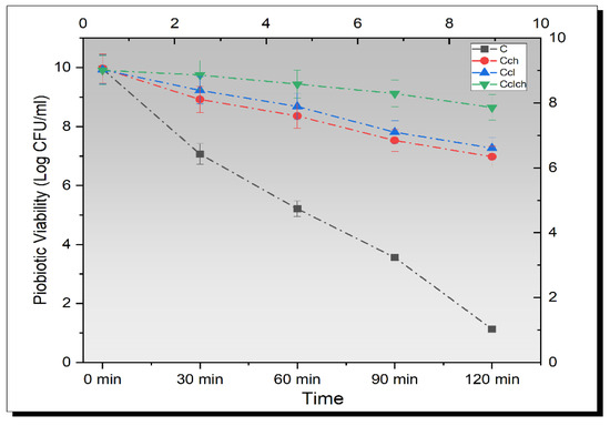 Viability of un-encapsulated and encapsulated (cellulose, chitosan, and cellulose–chitosan hybrid cells) probiotic microgels under simulated intestinal fluid during storage intervals (0, 30, 60, 90, and 120 min) compared with control. Each line represents mean value for viability of treatments. C (un-encapsulated probiotics), Cch (L. plantarum encapsulated with chitosan), Ccl (L. plantarum encapsulated with cellulose), and Cch-cl (L. plantarum encapsulated with chitosan and cellulose hybrid cells).