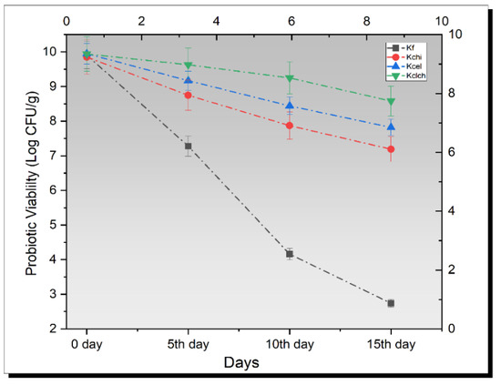 Mean results for probiotic viability are shown in Figure 4 Overall, a gradual significant decreasing trend was observed. The maximum probiotic viability was observed in kefir that was inoculated with Cl-Ch hybrid cells. A log reduction of 1.36 ± 0.01 CFU/g was observed in kefir loaded with Cl-Ch hybrid cells, while a log reduction of 2.13 ± 0.01 CFU/g was determined in kefir having cellulose-coated probiotics. In the case of kefir with chitosan encapsulated cells, a log reduction of 2.66 ± 0.03 CFU/g was monitored. The maximum value for log reduction was observed in kefir with free probiotics (7.17 ± 0.02 log CFU/g). Similar research for the growth of probiotic bacteria was conducted by Dinkçi et al. [34], and they found a relatively higher probiotic count. In addition, a relevant research study was also carried out by Güzel-Seydim et al. [35], and the authors suggested similar probiotic enumeration as in the present study.