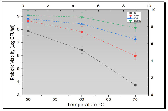 Previous studies have suggested that some gram-positive bacteria, including species of genera Lactobacillus, are heat resistant and can survive up to 75 °C; therefore, to prove this fact, bacterial species were subjected to heat shock (50 °C, 60 °C, 70 °C, and 80 °C) for 10 min. The obtained results showed a significant (p < 0.05) decrease in the bacterial population with an increase in temperature (Figure 5). Although the maximum peak was obtained for Cl-Ch-coated bacterial cells, the results from free probiotics showed a sharp decline in the viability under elevated heat shock, as shown in Figure 4. This is due to the fact that higher temperature causes the probiotic structure to unfold and denature the protein and other amino acid components, thus leading to the death of the live probiotic cells [36]. Lian et al. [37] suggested that the wall materials that are used for encapsulation have different physical properties and can act as a barrier against several adverse conditions.