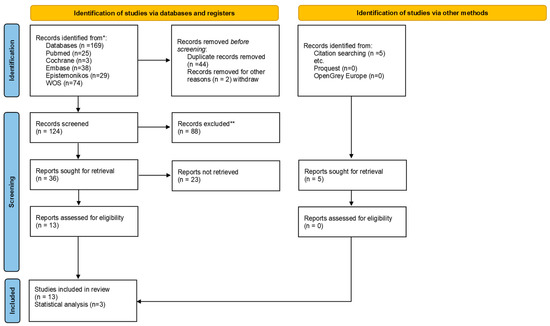 The selection scheme (flow chart) for this umbrella review is shown in Figure 1. The initial search in the different databases resulted in 169 articles, without additional documents from the grey literature, but with 5 articles included by manual searching. After removing duplicates, 124 articles were left for screening. Reading by title and abstract resulted in 36 articles for full reading because they met the eligibility criteria. Thirteen articles were included in the final qualitative review, with only 1 in the non-invasive category and 12 in the invasive method category.