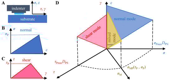 where σ Pmax and τ Pmax are the normal and tangential pull-off stress under quasi-static conditions, respectively, and D PS and D PN are the influencing factors of precompression strength on tangential and normal interfacial strength, respectively. σ Pmax and τ Pmax are saturation stress values in the normal and tangential directions, respectively. When σ P and τ P satisfy Equation (12), the tensile force under the mixed mode is calculated as σ MP = σ P 2 + τ P 2 (Figure 2D). The values in the bilinear CZM model considering the precompression strength are measured experimentally, and the results are given in the Supplementary Material. The first part of the Supplementary Material provides the experimental results and data fitting results [44] of the relationship between the adhesion strength and the precompression strength (Figure S1), and on this basis, the results of the precompression influence factors D PS and D PN were calculated; the second part provides the experimental results of the interface strength in different pull-off directions, and the saturation stress values in the normal and tangential directions ( σ Pmax and τ Pmax ) are obtained by ellipse fitting (Figure S2).