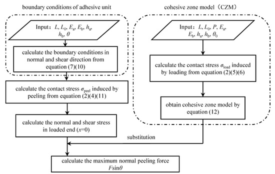 The peeling force between the adhesive unit and the substrate is determined by the interfacial adhesion stress formed during the compression process and the mechanical properties of the rigid-flexible coupling structure. According to the model of the rigid-flexible coupling adhesive unit, the model analysis flow of the adhesive unit in the compression and peeling process is established (Figure 3).