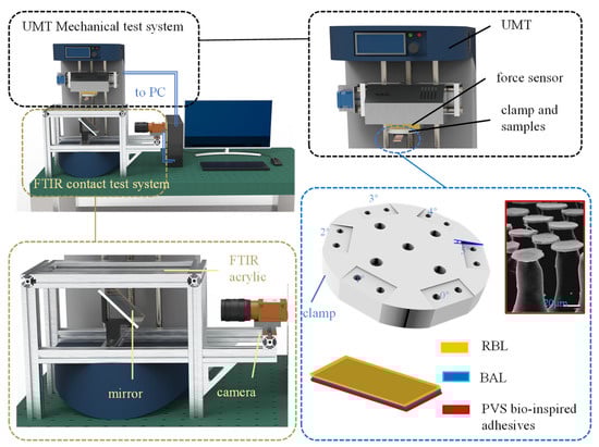 The platform for synchronously testing adhesive contact state and mechanics (Figure 4) is mainly composed of the UMT (Universal Mechanical Tester system, Bruker Nano Inc., San Jose, CA, USA) mechanical test system and the FTIR (frustrated total reflection) [45,46] contact state test system.