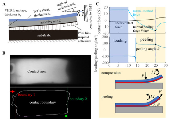 Figure 5. (A) Structural parameters and test conditions of the rigid-flexible coupling adhesive unit; (B) images of the contact area and boundary extraction acquired by the FTIR contact test system; (C) contact force and contact angle of the rigid-flexible coupling adhesive unit in the pre-press and peel stages acquired by the UMT mechanical test system.
