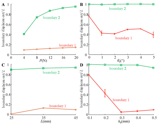 Figure 6. Boundary displacement of the adhesive unit for different (A) compression force P, (B) angle of inclination θ0, (C) unit length L, (D) and thickness of RBL hb.