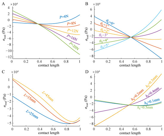 The strength of the adhesive interfaces depends on the preload stress. Although adhesion boundaries are exact, different preload stress may lead to a significant difference in the adhesive unit’s adhesion force (peeling force). However, there is currently no effective test method to obtain the interfacial contact stress of the adhesive unit when preloaded. Here, we further assume that the adhesive unit is in contact with the substrate over the entire length and use the numerical solution method in Section 2 to obtain characteristics of the stress distribution when the adhesive unit is in contact with the substrate under different working conditions.