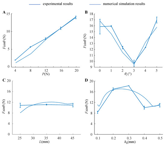 The numerical model analysis and experimental results of the normal peeling force between the adhesive unit and the substrate under different working conditions are shown in Figure 8. With the increase in P (Figure 8A), the normal peeling force increases linearly, and the ratio of adhesion force to preload (the ratio of the normal adhesive force Fsinθ to the preload P) of the entire system under this condition is about 0.7. With the increase in the inclined angle θ0 (Figure 8B), Fsinθ tends to decrease first, and increase afterward. When θ0 = 3°, Fsinθ reaches a minimum value of 10N, and the ratio of adhesion force to preload is about 0.625. When θ0 = 0° or θ0 = 5°, Fsinθ can exceed 16N, and the ratio of adhesion force to preload can be greater than 1 at this time. The length L of the adhesive unit has no significant effect on Fsinθ (Figure 8C), and the ratio of adhesion force to preload is about 0.7. As the thickness hb of the rigid layer increases, Fsinθ increases and then decreases (Figure 8D); when hb is selected to be 0.2 mm or 0.3 mm, the ratio of adhesion force to preload can be greater than 1.