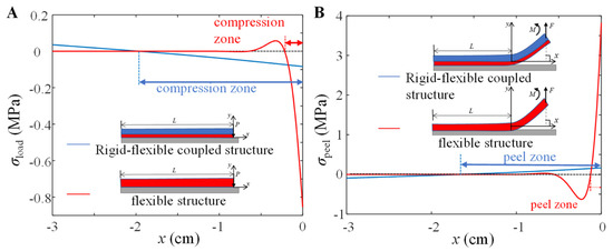 Figure 9. Numerical simulation results of the normal stress distribution of the rigid-flexible coupling adhesive unit and the flexible adhesive unit during the (A) compression process and (B) peeling process. The geometric parameters are taken as hb = 0.2 mm, ha = 3.4 mm, and L = 30 mm; the modulus of elasticity of the flexible adhesion unit is taken as 3 MPa, the normal force F = 10 N, and the peeling angle θ = 90°.