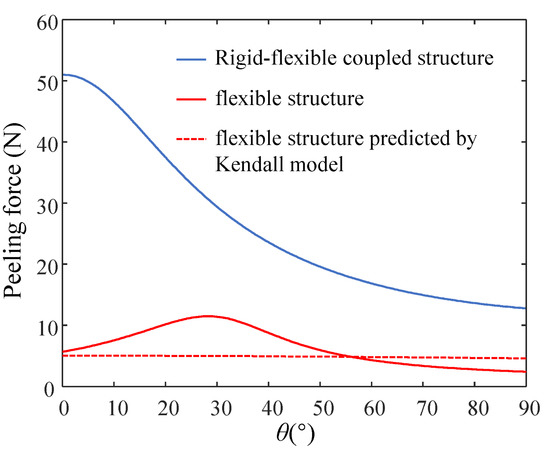 Figure 10. Variation of the peeling force with the peel angle for the rigid-flexible coupling adhesive unit and the flexible adhesive unit.