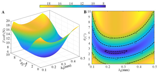 Figure 11. (A) Three-dimensional plot of the inclination angle θ0 and the thickness hb of the RBL for the normal peeling force Fsinθ; (B) the projection of the iso-Fsinθ line on the hb-θ0 plane. The compression force P = 16 N is used in the simulation.