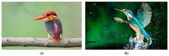(a) Oriental Dwarf Kingfisher (Ceyx erithacus) []; (b) typical flying sequence of the kingfisher after hunting. Look at the downstroke with full wing spread (alula’s) to generate lift (Image free from www.wallpaperflare.com) (accessed on 14 April 2022).