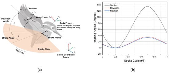 The wing motions are implemented using time histories of attitude angles that are rotated with respect to three different axes of the local coordinate system. As shown in Figure 3a, apart from global coordinate frame three more frames are defined; body (, , and ), stroke (, , and ) and wing (, , and ) coordinate frames. The wing stroke (), deviation (), and rotation () angles are expressed in terms of the horizontal stroke plane frame. Their relationship with one full stroke cycle is shown in Figure 3b. Body linear and angular velocities are specified about the body frame []. The use of a predictive quasi-steady model approximation is one such best method to look into the unsteady aerodynamic forces and their influence, such as translation, rotation, translation–rotation coupling, and added-mass effect). We focused on translational and rotational forces in a most simple way.