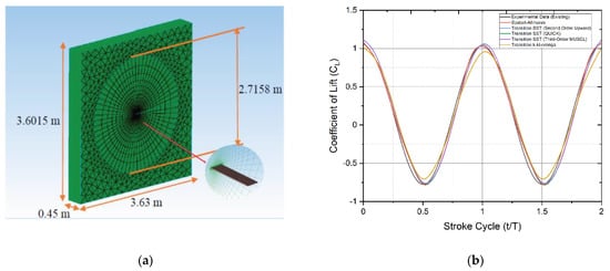(a) Numerical setup for turbulence model validation; (b) lift distribution for a single stroke cycle for different turbulence models and their comparative study with available experimental data.