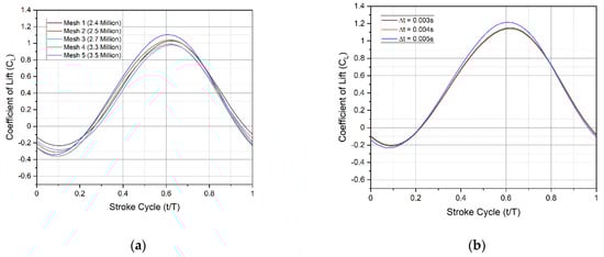 (a) Grid independence study and validation for a number of cells with normalized vertical force as a parameter of study for each stroke cycle; (b) time-step independence study and temporal evolution of mean lift as a parameter of study for different time-step in each stroke cycle.