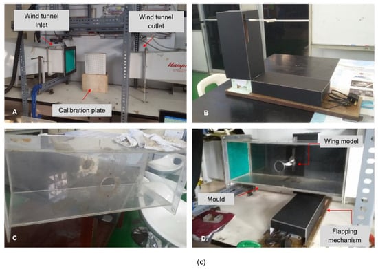 An experimental study was performed to ensure the validity of the numerical setup used here to investigate about aerodynamic characteristics of a dwarf Kingfisher-inspired flapping-wing model. The experiment aimed to provide appropriate evidence to support the numerical investigation used in this study. The flapping wing model was tested in a low-velocity wind tunnel equipped with a particle image velocimetry (PIV) system to analyze the velocity profile generated by the wing model’s vertical flapping motion. The numerical-experimental validation process needed data on velocity contours and vector plots. For simplicity, ease of handling, and cost efficiency, the validation test was carried out under the conditions described in Table 3. As shown in Figure 7a,b, the corrugated wing model made before for numerical calculations is 3D printed for experimental study. Figure 7c shows the flapping wing mechanism experimental test rig in detail. The test segment measures 0.3 m × 0.3 m × 1.0 m. Once the flow speed increased to 4.4 m/s, a smoke screen was injected into the test portion of the wind tunnel. The 2D PIV setup from Dantec Dynamics at the Aerodynamics Laboratory of Faculty of Engineering, Universiti Putra Malaysia is used for experimental test rig and analysis as shown in Figure 7c—Figure 7A–D.