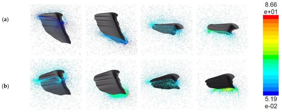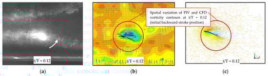 The aerodynamic force-time histories and flow fields obtained from experimental tests and CFD simulations are discussed in this section. The experimental force measurements and PIV flow field data are primarily used to study the kingfisher-inspired flapping wing’s predicted aerodynamic features. Figure 8a–c shows the comparison of velocity vector flow field obtained from PIV and CFD. Figure 9 measures and predicts the vector flow field from the numerical analysis for one full stroke cycle (a) t/T = 0.12, (b) 0.37, (c) 0.50, (d) 0.75) at a rotation angle of around 20° used for aerodynamic (lift and drag) force-time histories, clearly demonstrating flow separation at a later stage of flapping. Both the experiments and the numerical analysis show that there is a vortex generation that is akin to a combination of a leading-edge and bounded vortex, the energy of which is used to maintain lift during the downstroke. During the downstroke, the leading-edge vortices (LEV) near the wing root in Figure 10a,b is tightly formed and bonded to the wing. When compared to one other, both the CFD solution and the PIV were able to precisely estimate the LEV size and placement. The LEV has ruptured in Figure 10b, becoming more dispersed and separating from the wing surface. The production of vortices, secondary separation bubbles, and separated shear layers during flight indicates an exceedingly unsteady environment. The formation of strong stall related vortices, secondary separation bubbles, and separated shear layers shows an extremely unsteady environment, but the wing maintains the lift during the flight.