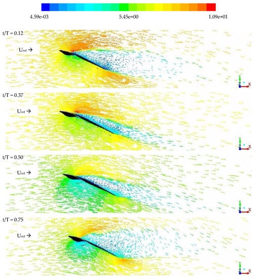 Vector flow field during the flapping motion (z-axis); left-to-right it shows the flow field vector plot during the moment of one full cycle (contours of motion during upstroke to downstroke at particularly chosen stroke cycle from t/T = 0.12, t/T = 0.37, t/T = 0.37, t/T = 0.75 at 20° AoA).