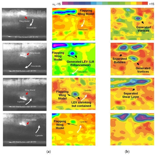 According to the experimental results shown in Figure 10a, the flow field around the wing generates a significant vortex upstream and a separation region far away from downstream on the wing. As the angle of attack increases, a strong vortex region near the trailing edge forms, the energy of which can be utilized further. The experimental analysis clearly shows the importance of making wing passive rotation necessary if bio-inspired imitation is to be successful in flight. In a stroke plane, the wing motion from upstroke to downstroke excites the layer of shear separation at the leading edge, which creates a form of Von Karman Vortex Street.