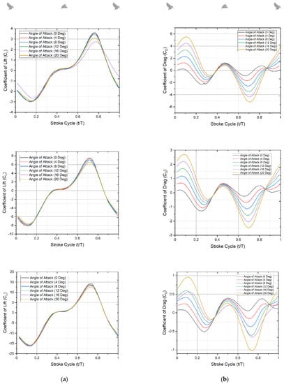 (a) Development of lift force during each stroke ( v/s t/T) at 4.4 m/s at f = 11 Hz; Lift force during each stroke ( v/s t/T) at 4.4 m/s at f = 16 Hz and lift force during each stroke ( v/s t/T) at 4.4 m/s at f = 21 Hz; (b) drag force during each stroke ( v/s t/T) at 4.4 m/s at f = 11 Hz; drag force during each stroke ( v/s t/T) at 4.4 m/s at f = 16 Hz and drag force during each stroke ( v/s t/T) at 4.4 m/s at f = 21 Hz. Forces are measured at different AoA ranging from 0° to 20°.