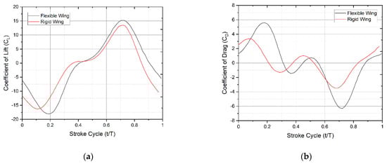 (a) Effect on lift production with respect to stroke cycle for corrugated rigid and flexible wing; (b) effect on drag with respect to stroke cycle for the corrugated rigid and flexible wing.