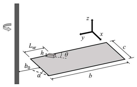 where μ is the dynamic viscosity of the water, ρ is the density of the water, and ω is the angular velocity (=3.14 rad/s) of a revolving wing. Ro is the ratio of the inertial force to the Coriolis force. Lentink and Dickinson determined that the Coriolis force promotes spanwise flow [9]. Bhat et al. showed that an increase in the Ro weakens the LEV and noted that Rob (=Rg/b) allows the flow structure and resultant aerodynamics to be characterized, where Rg is the radius of the gyration of the wing [7]. The wing models with/without an alula-VG used in this study were all under the same revolving motion, with Reb = 6.8 × 104 and Rob = 0.55. The Reb was similar to that for birds, and the Coriolis force (rotating effect) was dominant at a low Ro. The schematic diagram of the wing model with an alula-VG and the definitions of the geometric parameters are all shown in Figure 1.