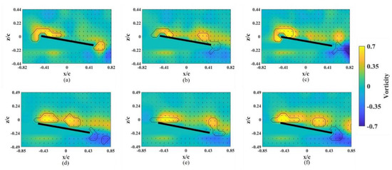 The flow field induced by a revolving wing helps to explain the corresponding flow structure, especially the LEV, at different x-z planes. The strength of the LEV is highly related to the strength of lift; the LEV structures shown at different spanwise planes also illustrate the lift distribution in the spanwise direction. As a control group, we discuss the flow field around the base wing model without an alula-VG; the instantaneous snapshots of the vorticity contour at α = 10° on different spanwise planes are shown in Figure 3. The LEV was stably attached to the region near the wing root (Figure 3a–c) and slightly lifted but still attached to the wing surface at other spanwise planes. The rise of the LEV in the spanwise direction indicates a tendency for flow separation at the outboard of the wing, but it is not obvious yet at a low angle of attack. The vorticity contours for the base wing model at α = 25° (pre-stall) on different spanwise planes are shown in Figure 4. The LEV was still attached to the wing surface in each plane and the size of the LEV slightly grew in the outer planes. The stably attached LEV was due to the strong rotating effect, which corresponds to the local Ro. The angular velocity was higher in the outboard plane than that in the inner plane. An LEV near the leading edge and a trailing-edge vortex (TEV) with a reversed spinning direction are clearly shown in the x–z plane on the outer wing sections (Figure 4c–f). Because stalling had not been shown in this pre-stall condition yet, the LEVs were stably attached to the wing surface on each plane. The results agree with those of the study by Jardin and Colonius [2], which showed that the LEV extended from the wing root to approximately three chords in the spanwise direction (r* = 0.12–0.87 for this study). However, there was also a spanwise variation in the strength of the LEV. This is because root-to-tip flow (or a spanwise pressure gradient) appeared [29]. Through the vorticity contour on different x-z planes, the intensity of the vortex increased toward the wingtip. The peak vorticity of the LEV was located farther downstream and at the outboard of the wing.
