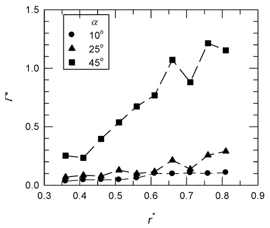 The values of Γ and Γ* were calculated for the simplest integration bound (a rectangle box of 1c × 0.5c) that was directly attached to the suction side of the wing [28]. The total circulation of the LEV, ΓLEV, was calculated by integrating the vorticity contour around the boundary of the LEV which was identified by Q-criteria. For the base wing model, the variations of Γ* on different x-z planes at different angles of attack are shown in Figure 6. There was a slight increase in the value of Γ* in the outboard region at α = 10° and 25°. Both angles of attack were below the stall angle of the revolving wing (α = 35°) [21]. For the post-stall condition (α = 45°), a significant increase in the value of Γ* happened, which was related to the growth of the LEV at a high angle of attack. However, in the outboard region of the wing, technically r* = 0.71, there was a dramatic decrease in the Γ* at both α = 25° and 45°. This is because there was a lower spanwise vorticity flux (the effect of the Coriolis force) and a zero-pressure gradient near the mid-span region, which induced the bursting of the LEV [7]. A lower value of Γ* means less lift production near the mid-span region.