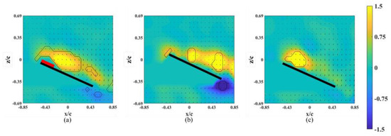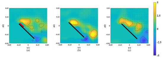 The instantaneous snapshots of the vorticity contour on different spanwise planes for the wing model on which an alula-VG was placed at Lw* = 0.25 (r* = 0.37) are shown in Figure 7 and Figure 8. The red mark represents the presence of an alula-VG in the measurement plane. In the pre-stall condition (α = 25°), there was a slight lift-off of the LEV, and the intensity of the LEV was larger on the x-z plane near the alula-VG (r* = 0.36, Figure 7a) than in the case without an alula-VG (Figure 4a). A trailing-edge vortex (TEV) with a reversed spinning direction was visible in the region near the wing root, which is not shown for the base wing model. The increment in the strength of the LEV with the presence of an alula-VG was due to the induced streamwise and spanwise flux, and this resulted in an increase in the lift. The LEV burst quickly in the spanwise direction. This indicates that the presence of the alula-VG resulted in the downstream movement of the LEV. It is also noted that there is only a small vortex structure shown in Figure 7b,c which is the x-z plane just a little bit away from the region covered with an alula-VG. At α = 45° (post-stall), the presence of an alula-VG also resulted in a lift-off and stronger LEV at r* = 0.36 (Figure 8a). Greater strength in the LEV indicates that, even in the post-stall condition, the presence of the alula-VG energized the LEV. At the outer planes (r* = 0.46, 0.56), although there was vortex bursting, the vortices did not lift off. In addition, the LEV was attached to the wing surface even at the region of the outboard of the alula-VG (r* = 0.56, shown in Figure 8c). The spanwise vorticity flux that was induced by the trailing vortex of the alula-VG resulted in a less concentrated LEV.