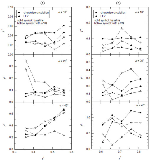 For the wing model with an alula-VG at Lw* = 0.25, the spanwise distributions of Γ* and ΓLEV* are shown in Figure 11a. The value of the base wing model is shown in a solid symbol as the control group. At α = 10°, the usage of an alula-VG was not beneficial for the intensity of the vortex for both Γ* and ΓLEV* at every x-z plane. This is because the vortex induced by the alula-VG affected the spanwise vorticity flux and the spanwise pressure gradient, which weakened the strength of the LEV and reduced the value of circulation. At higher angles of attack (α = 25° and 45°), there were increases in the values of ΓLEV* and Γ* in the region near the alula-VG. Toward the outboard region of the wing, the bursting of the LEV and the higher local Ro due to the revolving motion gradually diminished the effect of the alula-VG.